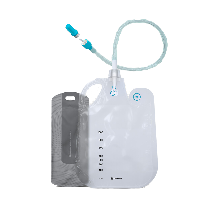 SpeediCath Flex Set is an all-in-one solution for men with a soft catheter featuring triple action coating technology, a dry-sleeve, a flexible tip and a dry-to-the touch bag.